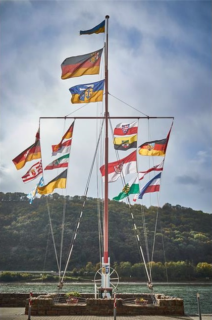 Der Schiffermast, das Wahrzeichen Kamp-Bornhofens, an der Rheinuferstraße mit den Flaggen der Bundesrepublik Deutschland, der 16 Bundesländer und der Ortsgemeinde (Bild: Peter Wendling)