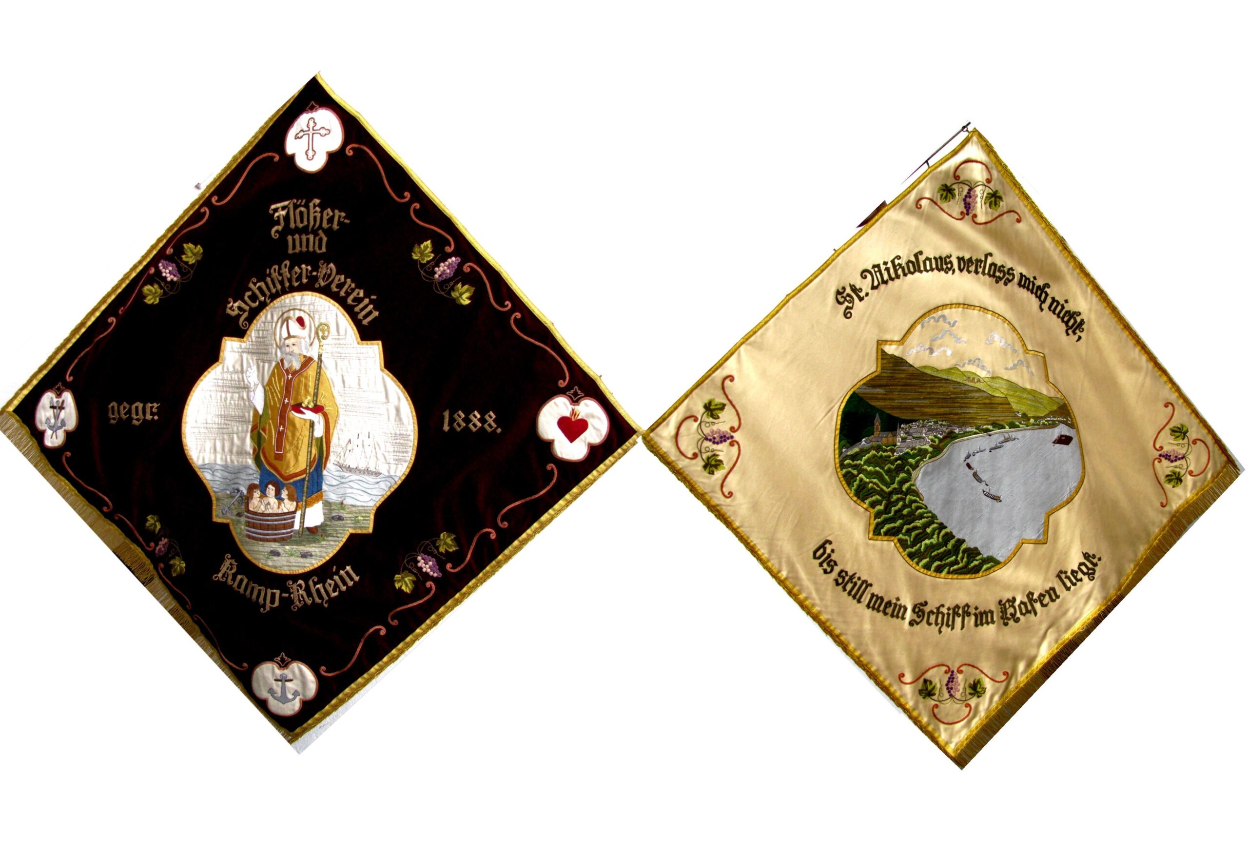 Vereinsfahne des “Flößer- und Schiffervereins” von Kamp am Rhein, gegründet 1888 mit dem Schutzpatron der Flößer, dem Hl. Sankt Nikolaus (Bild: Flößer- und Schiffermuseum Kamp-Bornhofen)